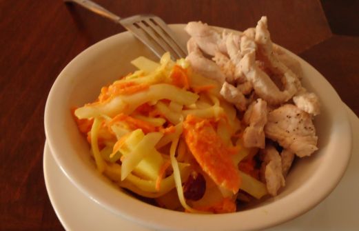 Vous pouvez également y mettre du chou rouge émincé ou du cèleri rapé. 1/4 chou blanc 3 carottes 1 pomme 1 poignée de noisettes 2cs huile de noix 1cs crème soja 1cs jus d'orange 1cs jus de citron 1cc curry sel poivre Emincez le chou. Faites bouillir de l'eau dans une casser [...]