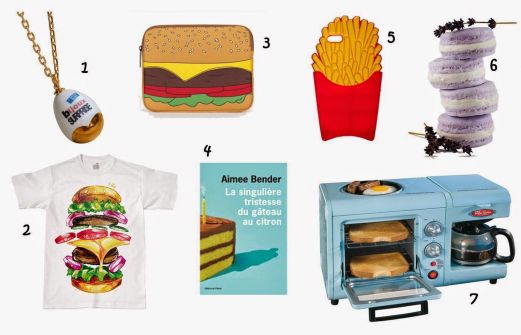 1. collier oeuf / miss bibi / 100€ 2. t shirt burger inside / sayfat / 23€ 3. housse ipad / l'avangardiste / 29.95€ 4. la singulière tristesse du gâteau au citron / aimee bender / 22.50€ 5. coque pour iphone / asos / 10.99€ 6. savon fantaisie macaron / paradis des  [...]