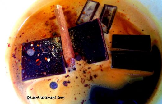 1|2 tasse environ d'espresso allongé 125g de chocolat 1 bâton de cannelle 1 bon morceau de gingembre du piment de la Jamaïque (3 ou 4, écasés au mortier) piment fort ( au boût) du sirop d'érable si on veut Le café s'écoule directement sur le chocolat.... et on réchauffe to [...]