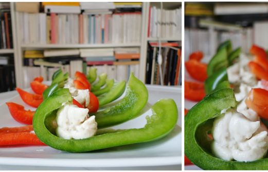 Poivrons rouge et poivron vert avec du houmous maison Poivron vert et rouge autour d'une sauce avec mascarpone yaourt grec et ciboulette Tomates cerises évidées avec billes de mozzarella Papillotes de bacon et/ou chorizo avec sauce yaourt grec-mascarpone-cib [...]
