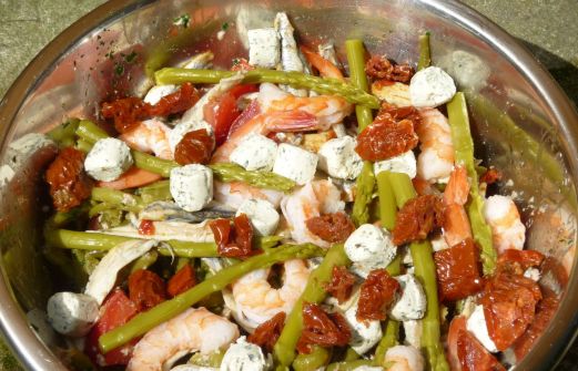 Une salade fraiche en plat unique pour le soir. Ingrédients : 1 boite de haricots verts 1 bocal de petites asperges Tomates Bocal de tomates séchées Crevettes décortiquées 1 bocal d'anchois Cubes de boursin Thon en boite Poivrons rouges en bocal Huile d'o [...]