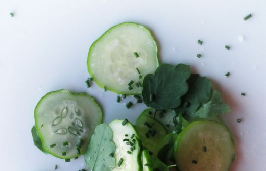 Cette semaine, le concombre et les tomates cerises rencontrent le papalo. Une jolie feuille verte aux dont les arômes épicés se marient en toute simplicité avec ces deux fruits estivaux.