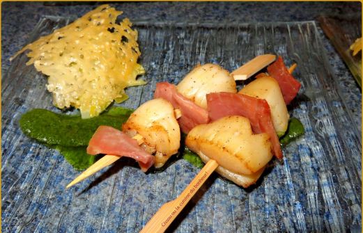 "Entrée de Noël" Quelle agréable saveur que celle des noix de coquilles Saint-Jacques! Une entrée toute en finesse et en douceur pour notre repas de Noël. Cette assiette est composée de brochettes de Saint-Jacques et jambon cru, d'une fondue de poireaux cachée sous une tuile [...]