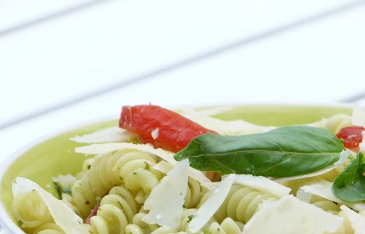 On a l'habitude de servir le pesto avec des pâtes chaudes. On pense plus rarement aux pâtes froides, en salade. Quelques poivrons grillés, un peu de parmesan... tous les parfums de l'été sont là! Ainsi que les couleurs de l'Italie...
