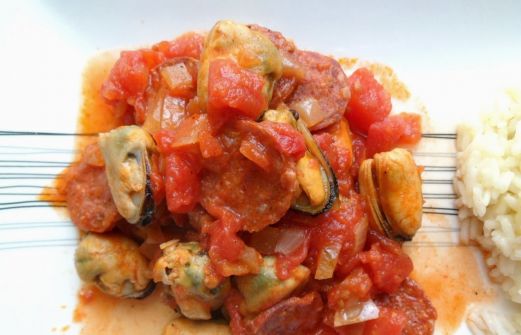 Des moules à la tomate bien relevées par les épices du chorizo. Pour 4 fourchettes : 500 g moules décoquillées surgelées 500 g tomates pelées (= 2 petites boites) 100 g chorizo doux 1 oignon 125 ml vin blanc sec La veille, décongeler les moules d [...]