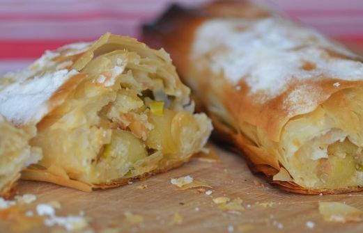 Il m'arrive parfois de faire la vraie pâte à Strudel ( clic ) mais comme l'heure est à la simplification dans ma cuisine j'ai testé cette version rapide issue du Cuisine et Vins de mars 2013.