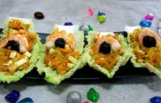 Ingrédients de la recette Recette pour 8 personnes Pour réaliser la vinaigrette au gingembre Vinaigrette au parfum de sésame Préparation 1 Barquettes de chou chinois (pe-tsaï) - 1.1 Couper les 2 extrémités des carottes, éplucher , laver sous l'eau froide. Eplucher la co [...]