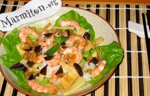Ingrédients (pour 4 personnes) : - 150 g de chair de crabe - 400 g de crevettes roses - 1 laitue - 1 oignon - 2 branches de menthe fraîche - 4 champignons noirs - 150 g de pousses de bambou - 1 cuillère à soupe de sucre en poudre - 2 cuillères à soupe de sauce soja - 1 cuillère à soupe de vin [...]