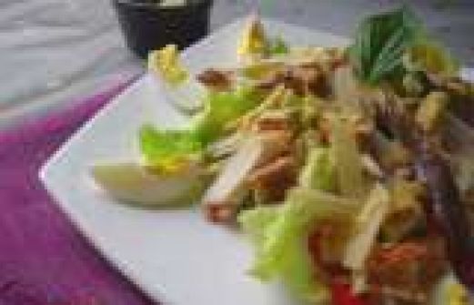 Ingrédients: 1 beau morceau de blanc de poulet rôti 4 tranche de bacon 1/2 baguette de pain 50 g de parmesan 1 salade romaine (ou laitue, ou autre salade que vous avez sous la main ou dans votre panier bio!!) 1 tomate 2 ufs durs 10 filets d'anchois 1 jaune d'uf 2 gousses d'ail l [...]