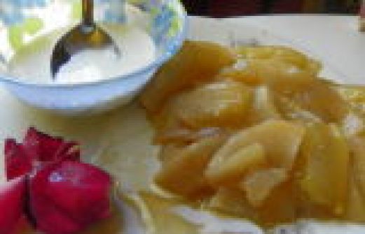 Ingrédients: 1 pâte brisée 4 Pommes 50 gr de pistaches Sucre Cassonade et 1 sachet de sucre vanillé 10 cl de crème Fraiche Préparation: Pelez et coupez les pommes en fines lamelles et mixez les pistaches Dans un moule à manqué beurré 22 cm, déposez une première couche de suc [...]