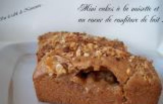 Ingrédients: ?2 oeufs ?90 grs de sucre ?100 grs de farine ?1/2 sachet de levure ?85 grs de beurre fondu ?8 CAC de purée de noisettes ?Confiture de lait ?Pépites de nougatine Préparation: 1.Préchauffer le four à 180° 2.Dans un saladier, fouetter les oeufs avec le sucre jusqu'à [...]