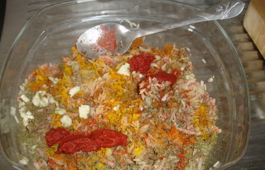 - sel, coriandre, poivre, curcuma, piment en poudre (felfel ahmer), menthe séché