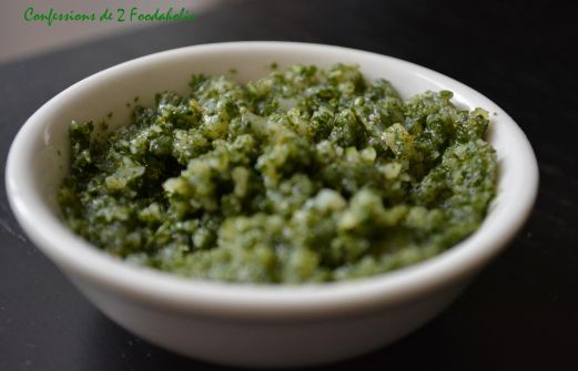 Voici une petite variante de pesto que j'ai fait quand j'ai voulu agrémenter mes spaghettis :) Le traditionnel "pesto alla genovese" se fait avec du basilic, des pignons, du parmesan, de l'ail et de l'huile d'olive. Je connais certaines personnes qui font des variantes en enlevant les pignons o [...]