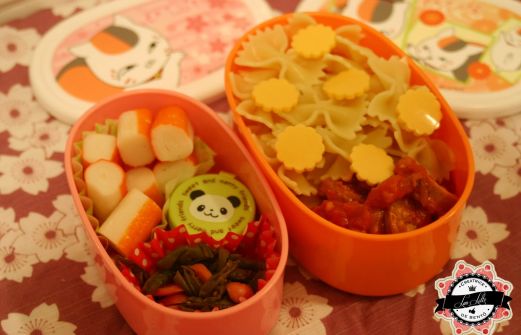 Je vous présente un petit bentô préparé très rapidement. Pour changer du riz (tout en continuant sur ma lancée) que j'ai tendance à mettre systématiquement dans mes jolies boites, j'ai opté pour des farfalle.