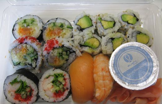 Ci-haut représenté : Des californiens, des avocado maki, un sashimi de crevette, un sashimi de saumon, de la sauce soya et du gingembre