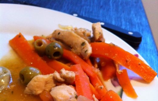2 escalopes de poulet- 1 oignon émincé- Persil- 1/2 cc de cumin- 1/2 cc de piment doux- 4 belles carottes- 8 olives vertes dénoy [...]