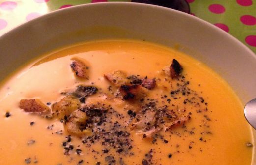 Avec l'automne viennent les premiers froids et les soupes réapparaissent sur nos tables. Fait hier soir à la demande de ma petite-fille, un velouté de potiron. Je n'ai rien inventé, la recette est classique, mais, comme d'habitude, j'y ai ajouté ma petite touche. Voici ce que cela donne.