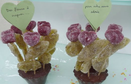 Voici ce que mes loulous ont offert à leur grand-mère hier. Pour changer des traditionnels bouquets de fleurs, je me suis amusée à confectionner des petits pots de fleurs qui se mangent.