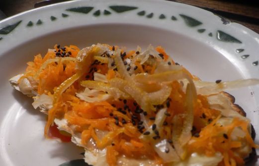 Dans le frigo et ailleurs il y avait: des carottes un reste de choucroute maison du pain azyme des baies rose du tahini un citron zeste de yuzu ou bergamote du piment d’Espelette Voilà, juste envie de grignoter devant un bon film, On tartine généreusement le pa [...]