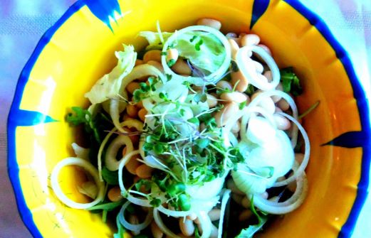 Puisque que je suis redevenue amie avec la salade Iceberg ... Iceberg (1 pomme) roquette (2 grosses poignées) oignon en fines tranches (1 gros) pousses de moutarde (1 bonne tasse) haricots blancs (1-2 tasses) avec une vinaigrette; dijon (1 cuillère à t [...]