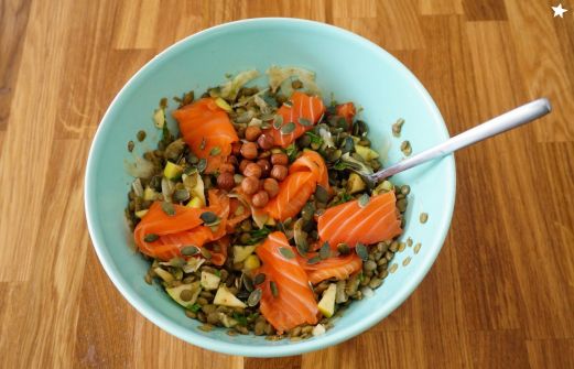 Une salade avec en vrac : des lentilles, du saumon fumé, du fenouil émincé finement, des petits morceaux de pommes, des noisettes, des graines de courge et une sauce moutarde à l'ancienne, huile d'olive, citron, sel et poivre...