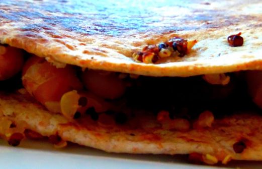 Du quinoa cuit (j'ai utilisé un mix de quinoas de 3 couleurs) Des haricots mélangés (une fois n'est pas coutume; une boîte de conserve!) Un peu de cumin Un petit oignon émincé très finement ... ... déposé entre 2 tortillas qu'on passe à la poêle. Enjoy! [...]
