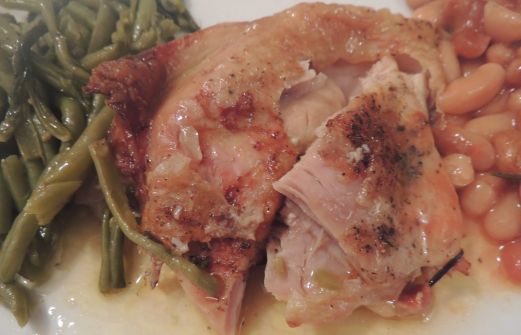 Cuisse de dinde au four. Trop bon et tout simple . Les doses sont au hasard, j'ai pris ce que je trouvais dans mon frigo. Le temps de cuissson varie selon le poids de la cuisse de dinde. Ingrédients: 2 Cuisses de dinde 2 gousses d'ail 4 feuilles de laurier 2 branches de roma [...]
