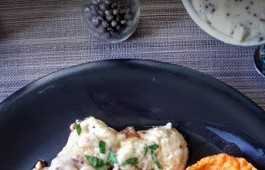 Sauce à la moutarde : beurre, farine, yaourt grec, moutarde et graines de moutarde.