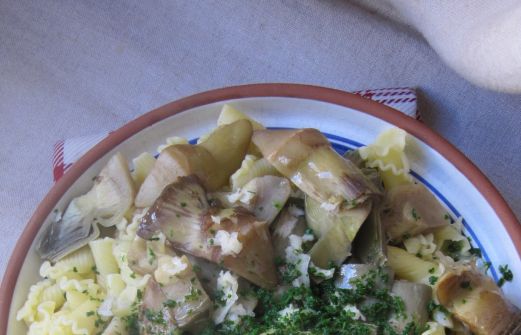 En cette saison, j'ai utilisé des coeurs d'artichaut surgelés, c'est tout à fait correct. J'ai présenté ce plat en accompagnement de croquettes de boeuf et d'une salade verte. Les pâtes font ici office de pain.