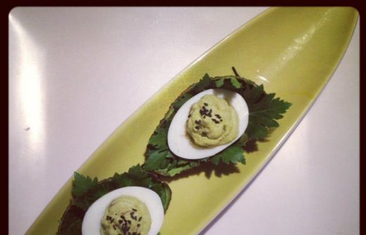 6 tojás 1 kisebb avokádó 1 teáskanál wasabi 1 evÅ‘kanál szezámolaj 1 lilahagyma/échalot 2 evÅ‘kanál ecetes gyömbérlé (Ãzlés szerint) Só, bors Pár szem fekete szezámmag A tojásokat sós vÃzben a forrástól számÃtva 9perc alatt keményre fÅ‘zzük, majd hideg vÃzbe téve hagyjuk kihűlni. Tör [...]