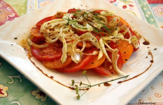 I ngrédients pour 2 personnes: 2 tomates (ici une rouge et une orange) 1/2 bulbe de fenouil sel et poivre noir du moulin huile d'olive vinaigre balsamique quelques gouttes de citron Préparation: Couper les tomates en fines tranches et poser au fond d'une assiette en [...]