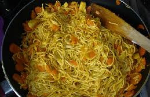 - 1 oignon - 1 carotte - 1 poivron - 250ml de lait de coco - 400 g de nouilles chinoises - 2 escalopes de poulet - 2 CS de curry - sel - poivre - huile