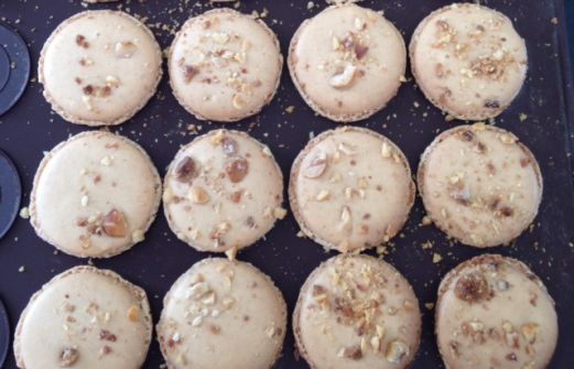 Ingrédients pour 70 coques : 75 g d'amandes en poudre - 75 g de noisettes en poudre - 150 g de sucre glace - 55 g de blancs d’Å“ufs vieillis (2 fois) - 150 g de sucre en poudre - 37 g d'eau minérale Ingrédients pour le praliné : 125 g de noisettes entières avec la pe [...]