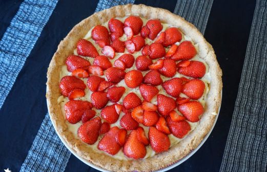 Le dessert du week-end avec des fraises sans doute pas encore très locales! Une pâte très goûteuse, qui apporte du croquant à l'ensemble, une crème toute onctueuse et des fraises! Simple et efficace!