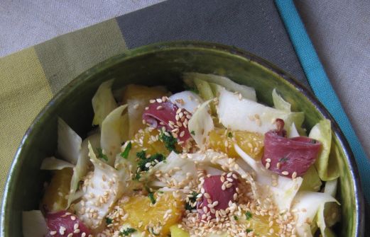 Une petite salade de saison vitaminée, vite prête. Ne pas la faire reposer plus de 10 min avant de la servir pour éviter de fatiguer les feuilles. Cependant, les endives gagnent à macérer quelques instants pour qu'elles s'imprègnent de vinaigrette.