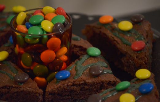 Ingrédients (pour 12 parts) : - 125g de beurre - 150g de chocolat noir - 2 œufs - 50g de sucre - 75g de cassonade - 120g de farine - 200g de M&M’s choco - 3 cuillères à soupe de sucre glace - Colorant vert C’est bi [...]