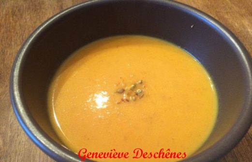 Cette soupe est une recette de mon amie Geneviève Deschênes. Voici donc son commentaire face à ce potage qui me semble tout à fait délicieux!
