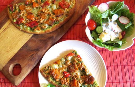 Une pâte à croûte mince du commerce, un pesto express maison, du saumon sockeye en conserve, des poivrons grillés et du fromage, un délice prêt en 20 min: un autre repas léger à servir un jour de canicule avec une bonne salade.