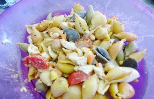 150 g de conchiglies aux légumes 250 g surimi 125 g de tomates cerise basilic 1/2 oignon rouge ou 1 petite échalote 200 g de haricots verts cuits Le jus d'1/2 citron Quelques feuilles d'épinard, de roque [...]