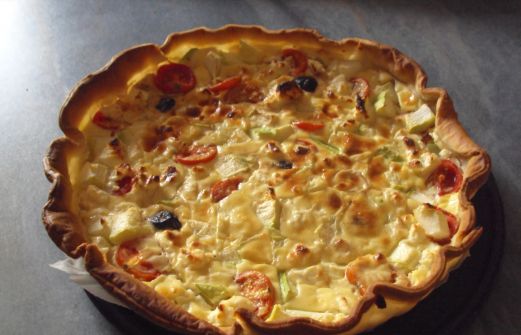 - 1 pâte brisée - 2 oeufs - 1 briquette de crème semi-épaisse - sel - muscade - 1 bonne cuillère à café de moutarde mi-forte - 1 bon morceau de courgette ou 1 petite - 1 grosse poignée de tomates cerises - 100gr feta - 5-6 olives noires Disposer la pâte dans un plat à tarte. Mettre [...]