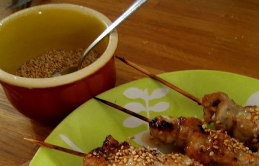 Pour changer des saucisses-merguez ou des traditionnelles brochettes sur le grill du barbecue ! pour 4 personnes : 500 g de viande de porc dans l'échine un oignon nouveau un peu de citronnelle sauce soja miel huile de tournesol graines de sésame fleur de sel Préparer la m [...]