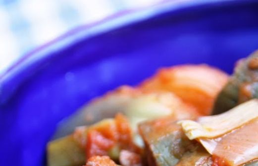 Ingrédients pour 4 pers. : * 8 à 10 petits artichauts "petits violets" ou "poivrades" * 200 g de lard fumé * 2 oignons rouges * 1 gousse d'ail * 2 verres de vin blanc sec * 1 boîte de tomates concassées * 1 cs de concentré de tomate * 1 feuille de laurier * 1 branche de thym * 3 cs d' [...]