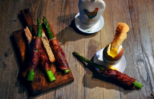 Aujourd’hui, une rhapsodie sur le thème d’asperges : Velouté d’asperges vertes, Å“uf à la coque, et mouillette d’asperges !