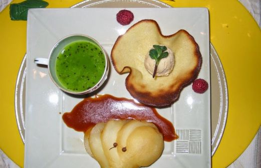 Ingrédients pour 6 personnes : ½ poire rôtie ou pochée 10 cl de coulis aux kiwis 1 cuillère à soupe de caramel au beurre salé 1 cuillère de glace à la vanille tuiles aux amandes 1 feuille de menthe quelques fruits rouges