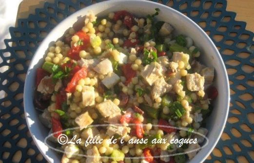 Une première pour moi que l'utilisation du couscous israélien, ou couscous de Jérusalem! Je connaissais le produit pour l'avoir vu circuler sur le net, mais c'est sa disponibilité dans les épiceries qui posait problème pour moi. Ce couscous est beaucoup plus gros que le couscous régulier, un pe [...]