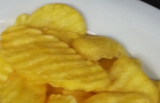 Pommes de terre coupées en tranches de 3 mm d’épaisseur à l’aide d’une mandoline et frites dans l'huile deux fois, un à 140 ° et un autre à 170 °C.