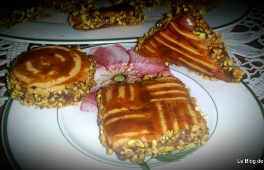 Des biscuits fondants garnis de confiture ou pâte à tartiner et décorés de pistaches torréfiées.