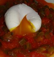 150 g de lardons allumettes 1 oignon rouge émincé 3 poivrons de couleurs 1 poivron jaune en dès 400 g de tomates en dès 2 cs de purée de tomate 4 oeufs Feuill [...]
