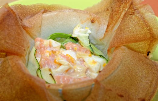 Préparation : 10 minutes Cuisson : 15 minutes Ingrédients (pour 4 personnes) : 2 Pélardons (fromage de chévre) 4 tranches de saumon fumé 1 oeuf dur 1 courgette ciboulette 1 cs de crême fraîche 4 feuilles de brick [...]