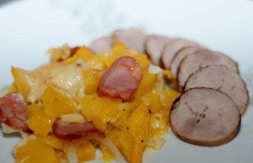 Préparation : 25 minutes Cuisson : 20 minutes Ingrédients (pour 2 personnes) : 1 saucisse au couteau 1 petit potiron 10 tranches de chorizo 1 gousse d'ail 1 petit oignon 10 gr de beurre 50 gr de gruyère huile d'olive sel,poivre [...]